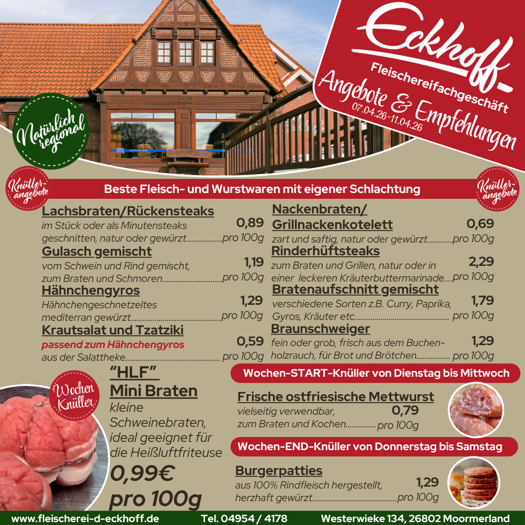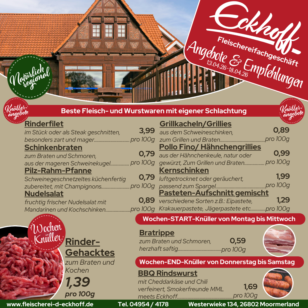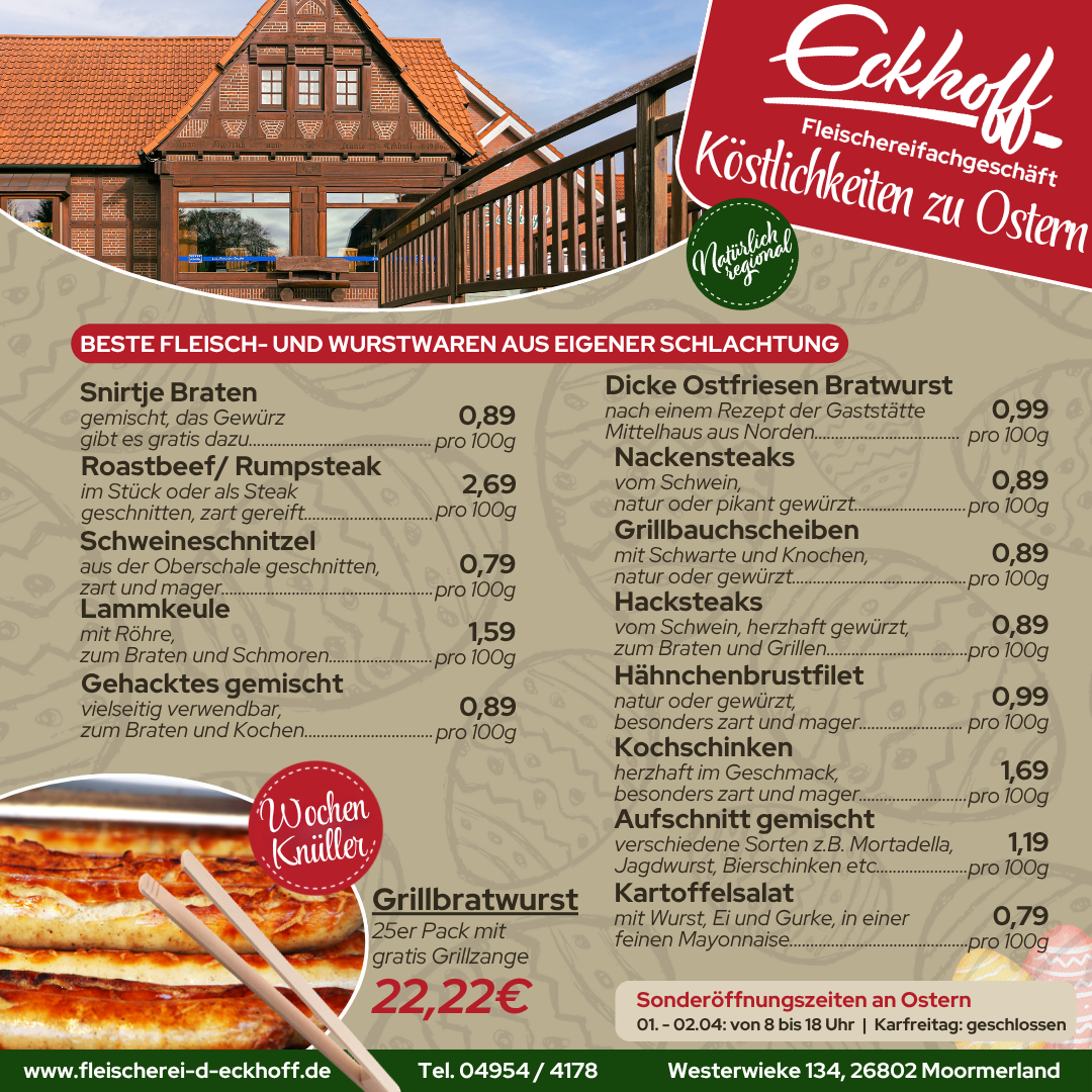 Wenn Sie qualitativ hochwertige, regional produzierte Fleischwaren suchen, sind Sie bei Eckhoff in Jheringsfehn goldrichtig. Wir stehen mit unserem seit 1934 ständig verbesserten Handwerk für Ihren regionalen Fleischgenuss. In unserem großzügigen Laden finden Fleisch- und Wurstgenießer alles, was das Herz begehrt: Erstklassige Schinken, täglich frisch hergestellte Wurstwaren und Salami, Feinkostsalate sowie nationale und internationale Käsespezialitäten. Unsere heiße Theke und das Selbstbedienungs-Kühlregal bieten vorverpackte Ware, Wurst-Gläser und Spezialitäten zum Mitnehmen.