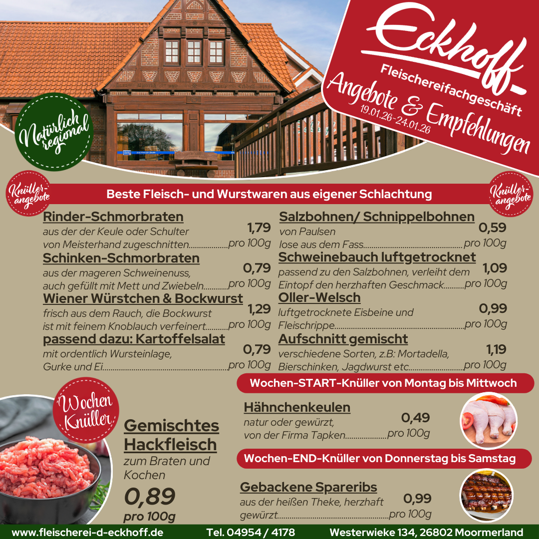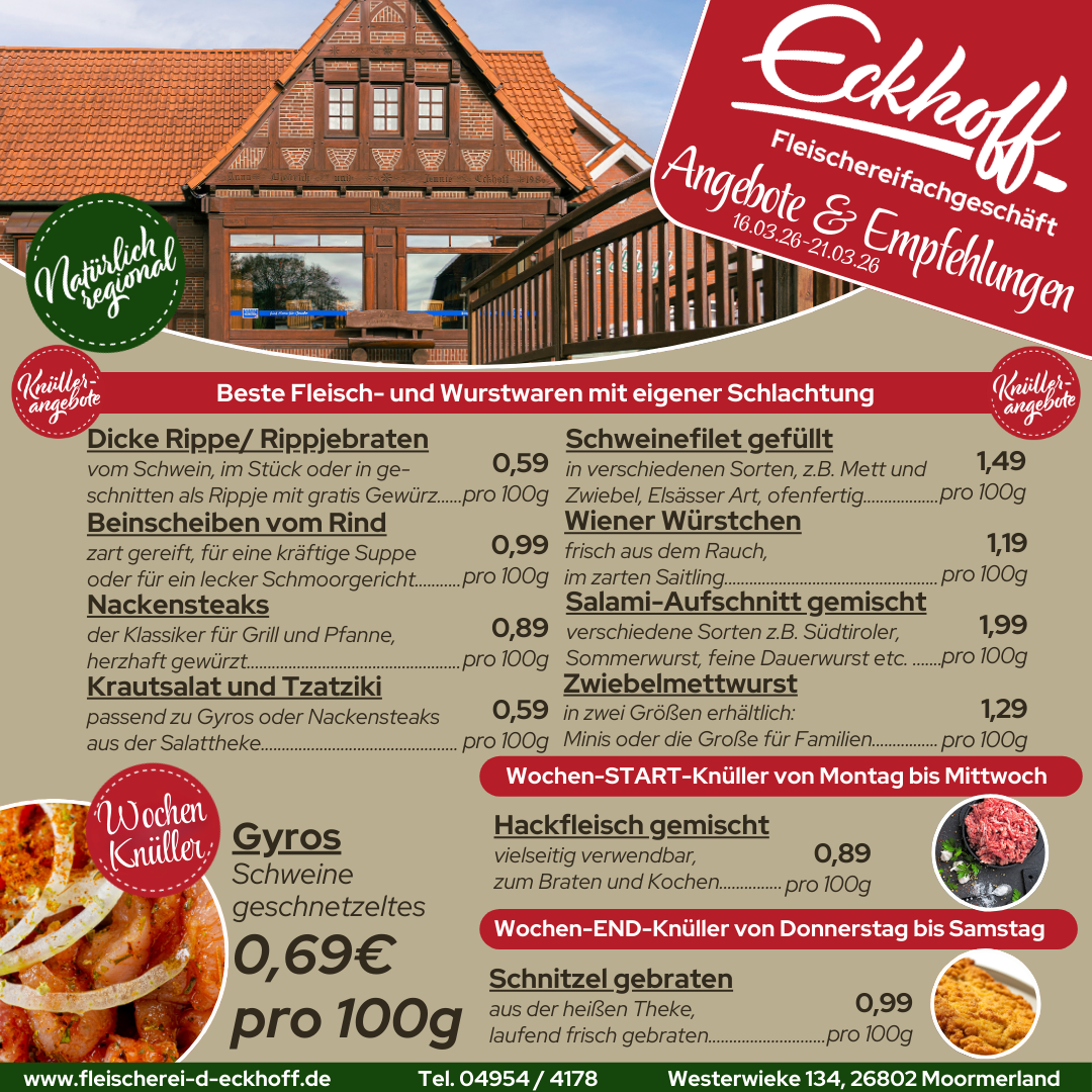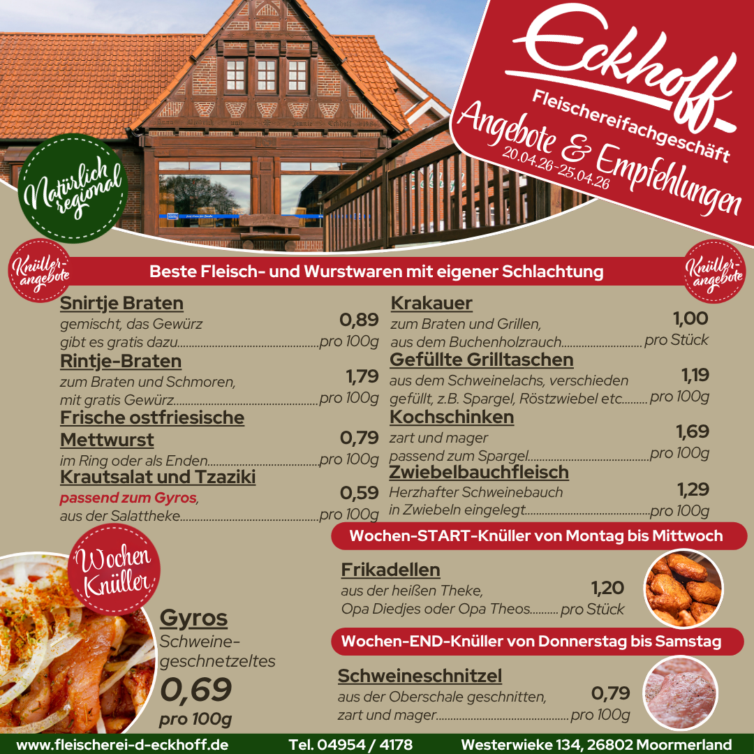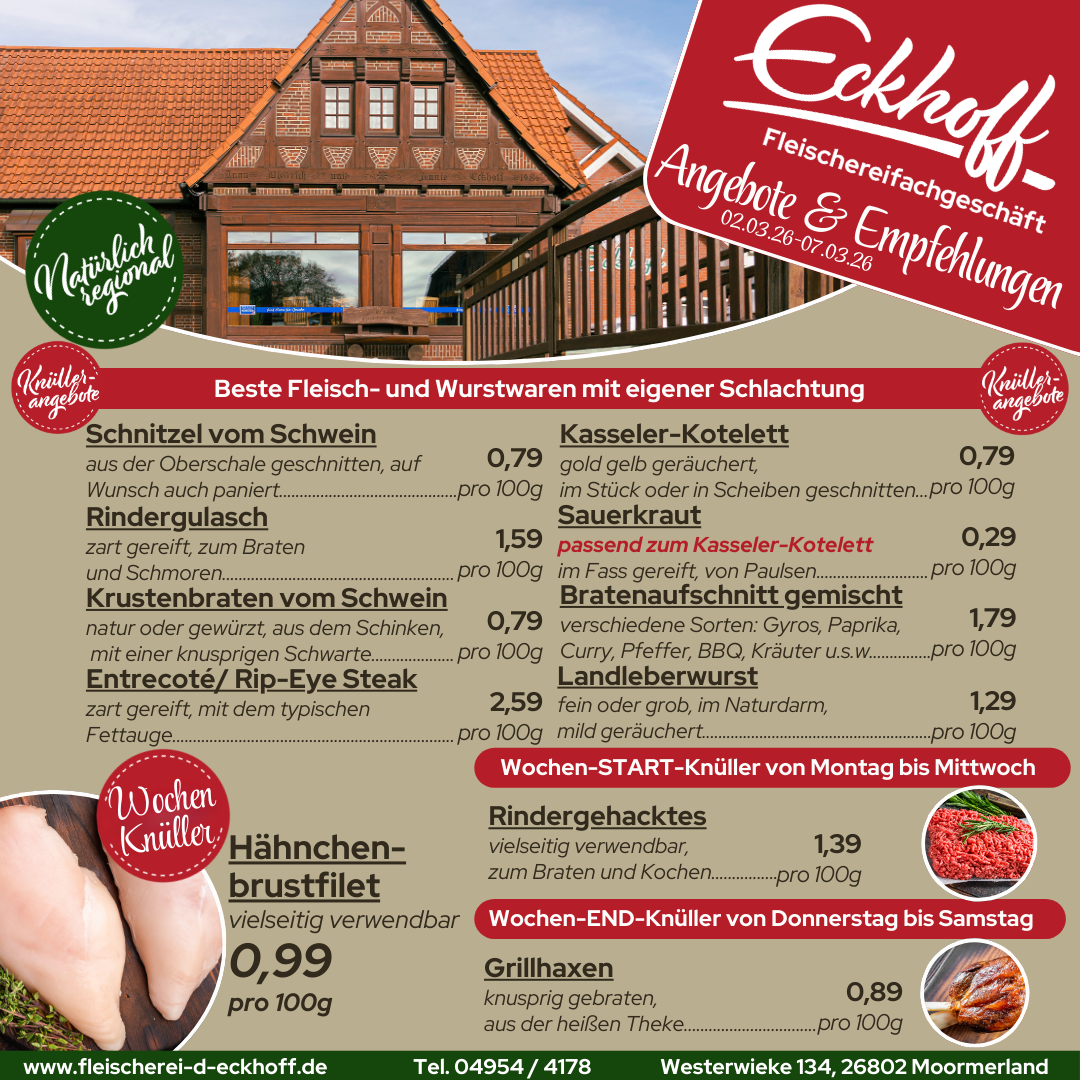 Wenn Sie qualitativ hochwertige, regional produzierte Fleischwaren suchen, sind Sie bei Eckhoff in Jheringsfehn goldrichtig. Wir stehen mit unserem seit 1934 ständig verbesserten Handwerk für Ihren regionalen Fleischgenuss. In unserem großzügigen Laden finden Fleisch- und Wurstgenießer alles, was das Herz begehrt: Erstklassige Schinken, täglich frisch hergestellte Wurstwaren und Salami, Feinkostsalate sowie nationale und internationale Käsespezialitäten. Unsere heiße Theke und das Selbstbedienungs-Kühlregal bieten vorverpackte Ware, Wurst-Gläser und Spezialitäten zum Mitnehmen.